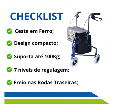 O uso do Andador com 3 rodas, traz independência e liberdade aos idosos que precisam de apoio e estabilidade e auxiliando na sustentação do corpo ao andar ou ao permanecer em pé, sendo possível caminhar sozinho, com acionamento rápido dos freios para cima e caso precise repousar basta acionar o mesmo para baixo.