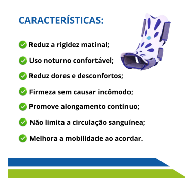 Com design anatômico, materiais duráveis e sistema de ajuste personalizado por tiras de fixação, a órtese proporciona segurança, estabilidade e conforto durante toda a noite.