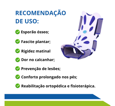 Indicada por especialistas em ortopedia e fisioterapia, essa órtese mantém o pé em posição funcional de alongamento suave, ajudando a prevenir dores matinais, rigidez e sobrecarga nas articulações.