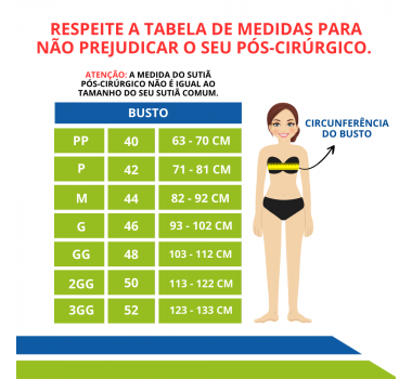 Para tirar a medida certinho, você precisa posicionar a fita métrica na altura dos seios, logo após compare as suas medidas com a tabela de medidas.