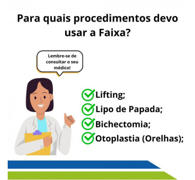 O uso da máscara normalmente é indicado pelos médicos, já que é responsável por reconstruir a aderência da musculatura com o osso e para diminuir o inchaço provocado pela cirurgia, possui fecho em velcro e possibilita o ajuste conforme sua necessidade, não possui costuras evitando marcas na pele.