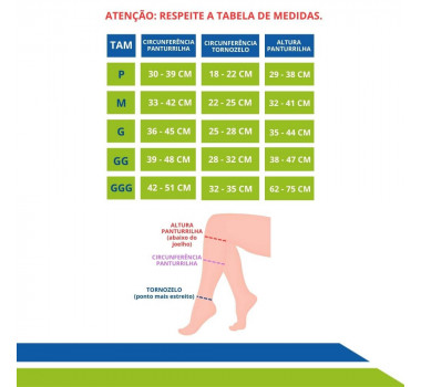 Recomendamos que com auxílio de uma fita métrica, meça a circunferência do tornozelo e da panturrilha, logo após compare as suas medidas com a tabela de medidas.