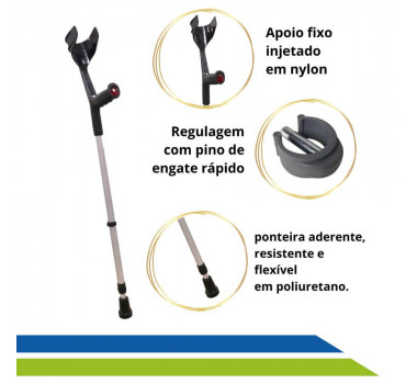 Sua estrutura é em alumínio, possui braçadeira, apoio para o braço e um par de ponteiras antiderrapante na extremidade inferior.