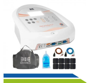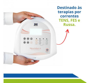 O Neurodyn II é um equipamento para aplicação de corrente elétrica via eletrodos em contato direto com o paciente para terapia de disfunções neuromusculares com as correntes TENS, FES e Russa e conta com quatro canais com ajuste de intensidade independentes, possibilitando a escolha de parâmetros, entretanto, oferece programas de terapias pré-determinados para facilitar os atendimentos.