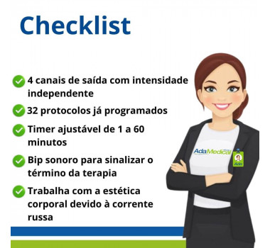 Já a corrente TENS é indicada para alívio sintomático e tratamento da dor crônica, aumento a circulação sanguínea local, alívio sintomático da dor pós-traumática aguda e dor pós-operatória aguda. Utilizado na fisioterapia ortopédica, traumatológica, reumatológica e neurológica promovem também analgesia e fortalecimento muscular. Além disso, há também a corrente russa, que é um estímulo elétrico utilizado para produzir contrações musculares no local que é aplicado. Por meio de sua terapia é possível melhorar o tônus muscular e a flacidez da pele, além de estimular a circulação sanguínea e linfática. O Tens Neurodyn é um equipamento utilizado na terapia de disfunções neuromusculares e conta com quatro canais com ajuste de intensidade independentes que facilita o atendimento.