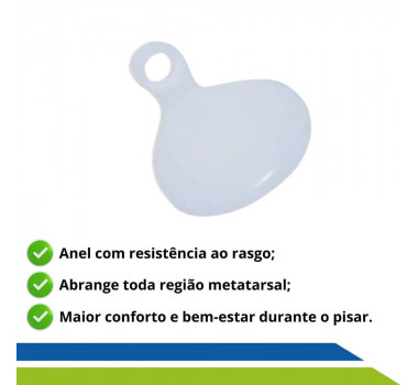Este produto foi confeccionado com exclusiva fórmula, proporcionado maior durabilidade, Anel com alta resistência ao rasgo. Seu formato ovalado abrange com eficácia toda região metatarsal oferecendo maior conforto, estabilidade e bem-estar durante o pisar. Sua espessura e consistência foram especialmente fabricados para o uso ortopédico. Podendo ser usado em calçados abertos e fechados.