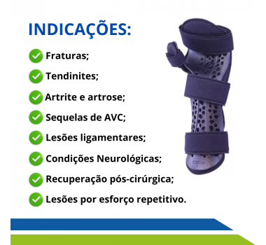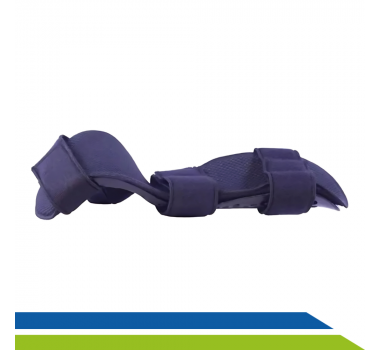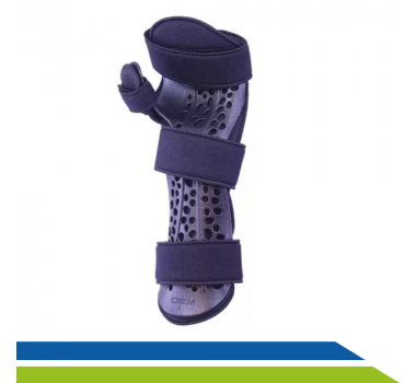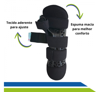 Confeccionado em copolímero, possui um formato anatômico que acomoda confortavelmente o membro, além de possuir forração interna proporcionando maciez e fixação ajustável através de fechos aderentes.