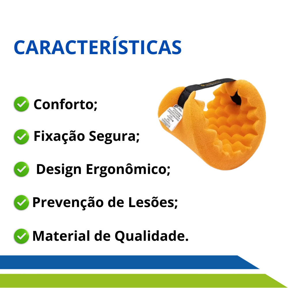 Conta com uma fita de fixação em tecido aderente, garantindo que o protetor permaneça no lugar, evitando deslizamentos e promovendo o ajuste perfeito para o usuário.