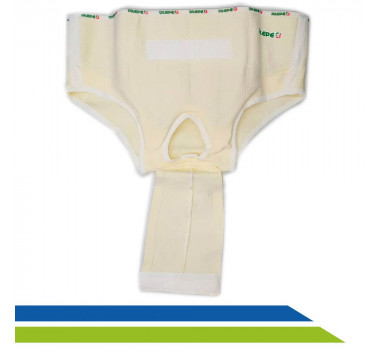 Conhecida como cinta, sunga ou cueca para hérnia, ela possui duas almofadas removíveis que possibilita a compressão apenas de um dos lados direito ou esquerdo, ou se necessário dos dois ao mesmo tempo.