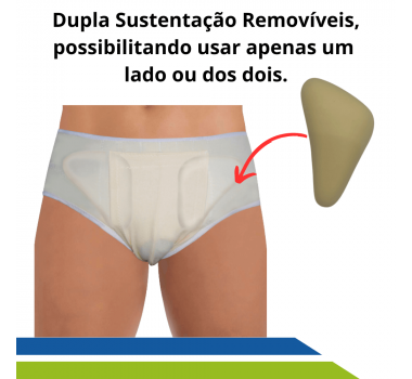 A cueca auxilia na sustentação da Hérnia Inguinal, evitando o seu crescimento e proporcionando uma dupla sustentação.
