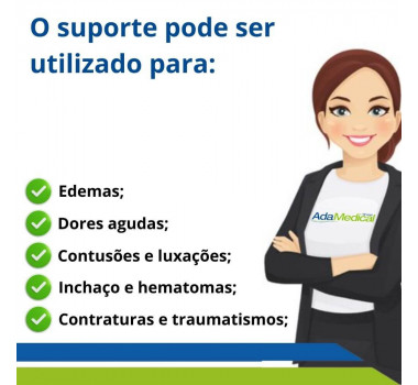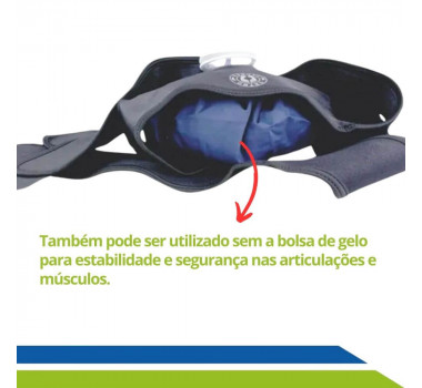 O Suporte de Neoprene com Bolsa de Gelo torna o tratamento da crioterapia (frio terapêutico) mais eficiente, prático e versátil, permitindo a movimentação e mantendo as mãos livres durante a aplicação. O Suporte de Neoprene também pode ser utilizado sem a bolsa de gelo e quando em contato com o corpo eleva a temperatura, aumenta a circulação e proporciona maior estabilidade e segurança as articulações e músculos, pois previne contra traumas e contusões.