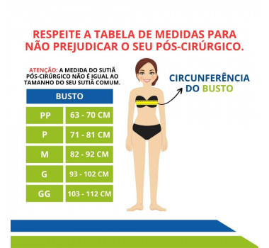 A medida a levar em consideração no momento da compra é justamente a circunferência abaixo do seio já que o sutiã tem a finalidade de dar sustentação ao seio e não deixar que as próteses se movimentem durante o processo pós-operatório.