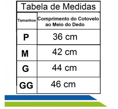 Meça do cotovelo até o meio do dedo mínimo e compare a medida com a tabela de medidas